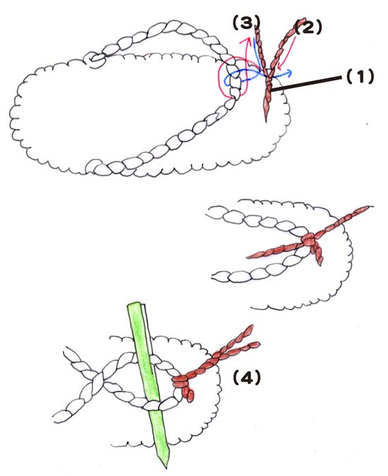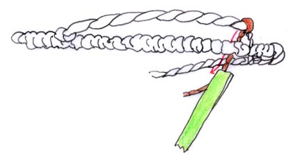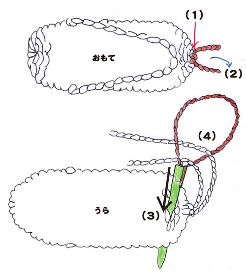(2)よった上の一方おひもを上から下に緒にまきつける。