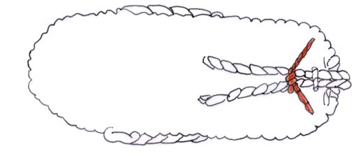 (4)まきつけたら、鼻緒のひもを合わせてもう一度2cmほどよる。