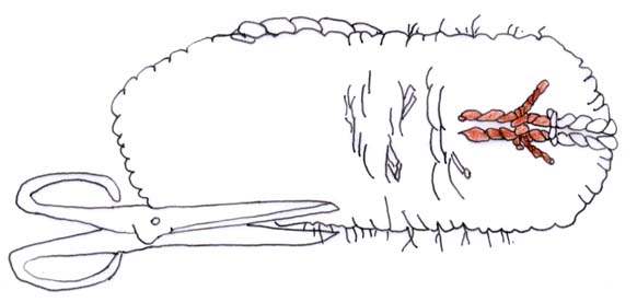 (3)芯になるひも、鼻緒のひもの先を2cmぐらい残してはさみで切る。